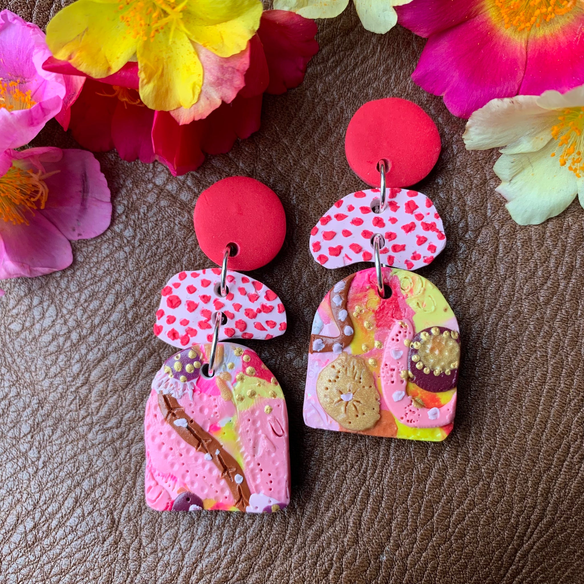 This pair of earrings is made of polymer clay. The posts are made of surgical-grade stainless steel we also use the same material for our ear nuts and jump rings. Or gold plates hoops, hooks or stud tops in dangles are used.