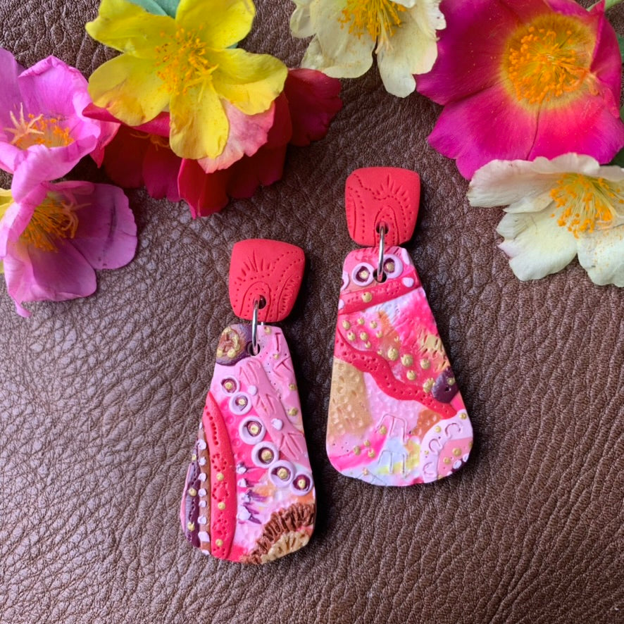 This pair of earrings is made of polymer clay. The posts are made of surgical-grade stainless steel we also use the same material for our ear nuts and jump rings. Or gold plates hoops, hooks or stud tops in dangles are used.