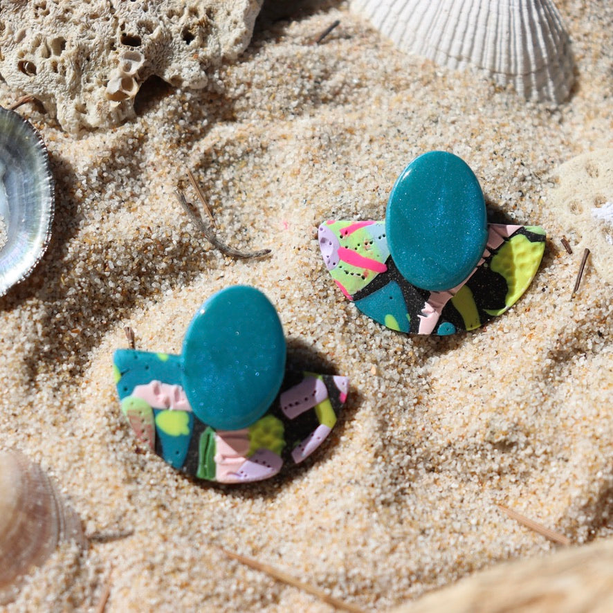 This pair of earrings is made of polymer clay. The posts are made of surgical-grade stainless steel we also use the same material for our ear nuts and jump rings. Or gold plates hoops, hooks or stud tops in dangles are used.