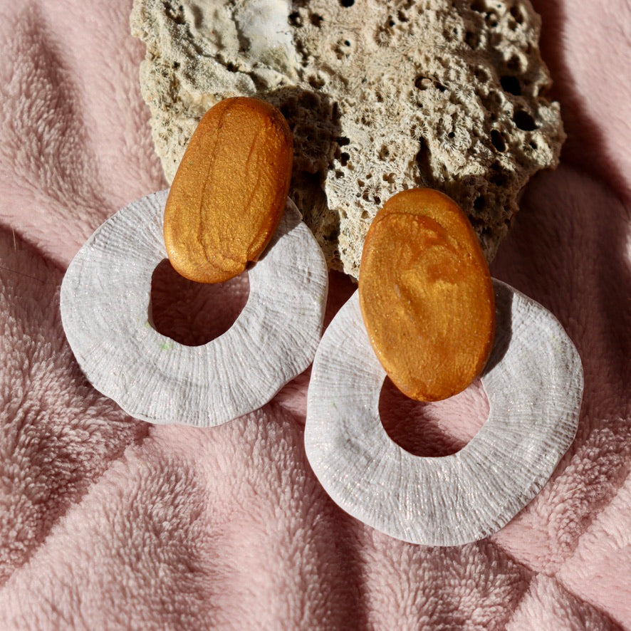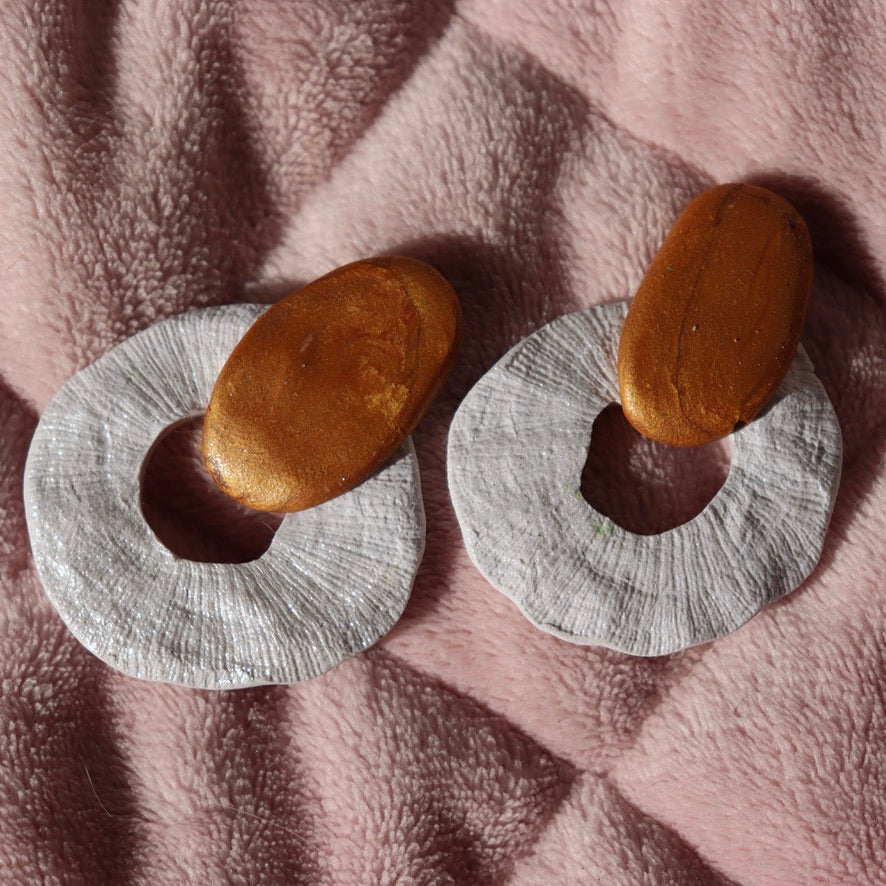 This pair of earrings is made of polymer clay. The posts are made of surgical-grade stainless steel we also use the same material for our ear nuts and jump rings. Or gold plates hoops, hooks or stud tops in dangles are used.